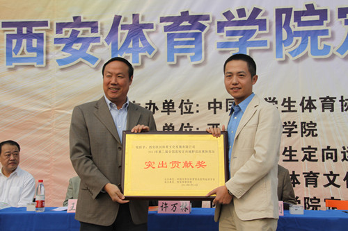 我院院长苏明理代表全国大学生定向越野协会授予欧润公司“突出贡献奖”