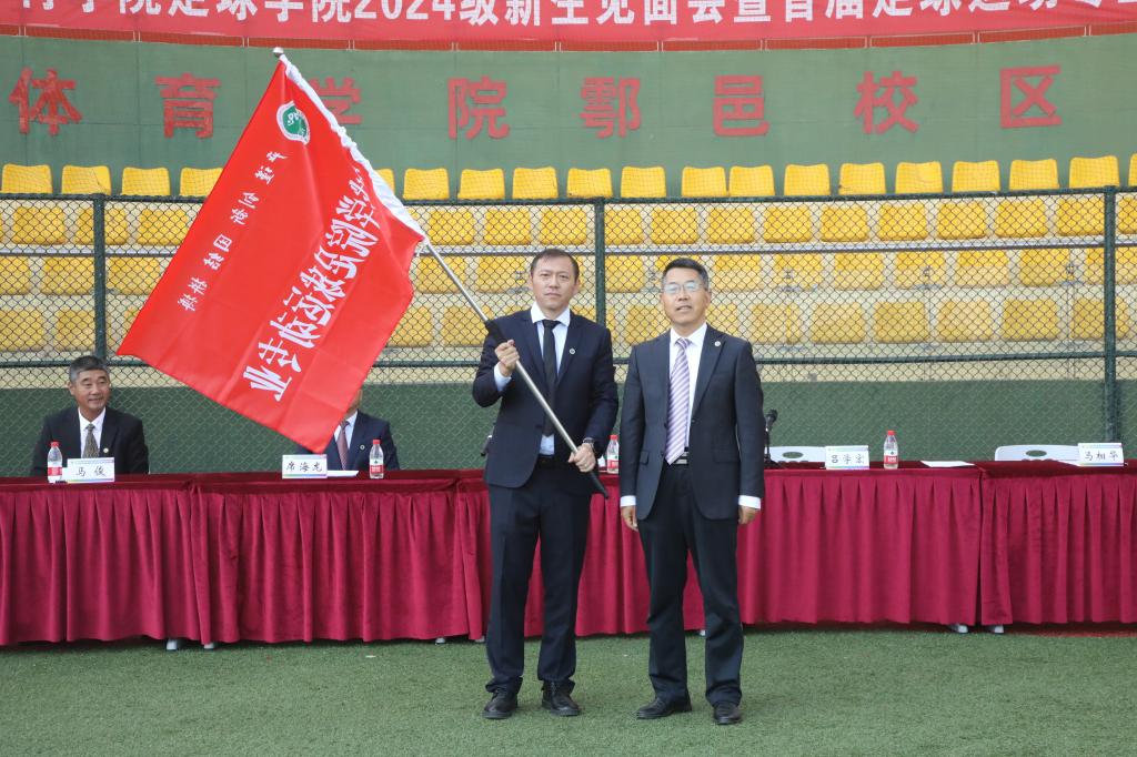 杨芳乾为首届足球运动专业授旗。他向全体新生提出三点殷切希望:一是爱西体。要热爱梦想起航的地方,珍惜大学时光,努力学习,为学校的校风校貌增光添彩,展现出西体学子的风采与担当,为体育事业的繁荣注入青春动力。二是爱足院。要深爱这个独具特色的学院,它培养了众多足球人才,为国家足球教育事业做出了应有贡献。新生们应珍惜在足球学院学习的宝贵机会,刻苦训练,不断提升自己的专业水平和技能。三是爱足球。要加强足球锻炼,磨砺意志品质,保持身心健康,为体育强国贡献力量。